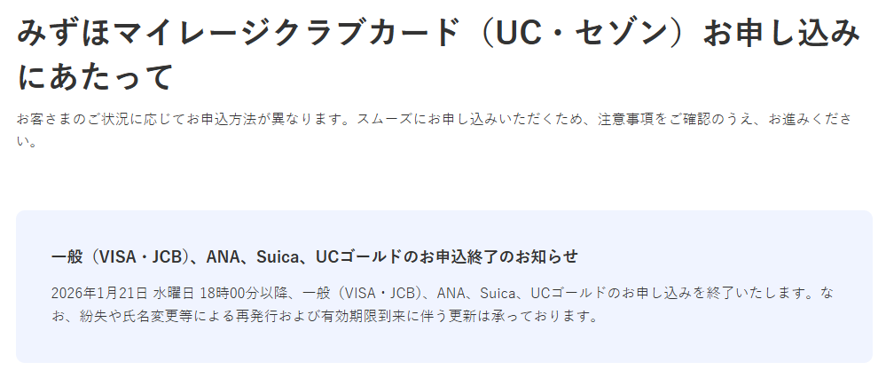 みずほマイレージクラブカード/ANAの申し込みが2026年1月21日18時で終了するようです。
