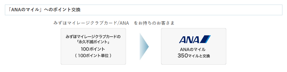 みずほマイレージクラブカード/ANAの特典として永久不滅ポイント100ポイントを350ANAマイルに交換することができます。(永久不滅は1ポイント相当なので、実質70%でANAのマイルに交換可能)